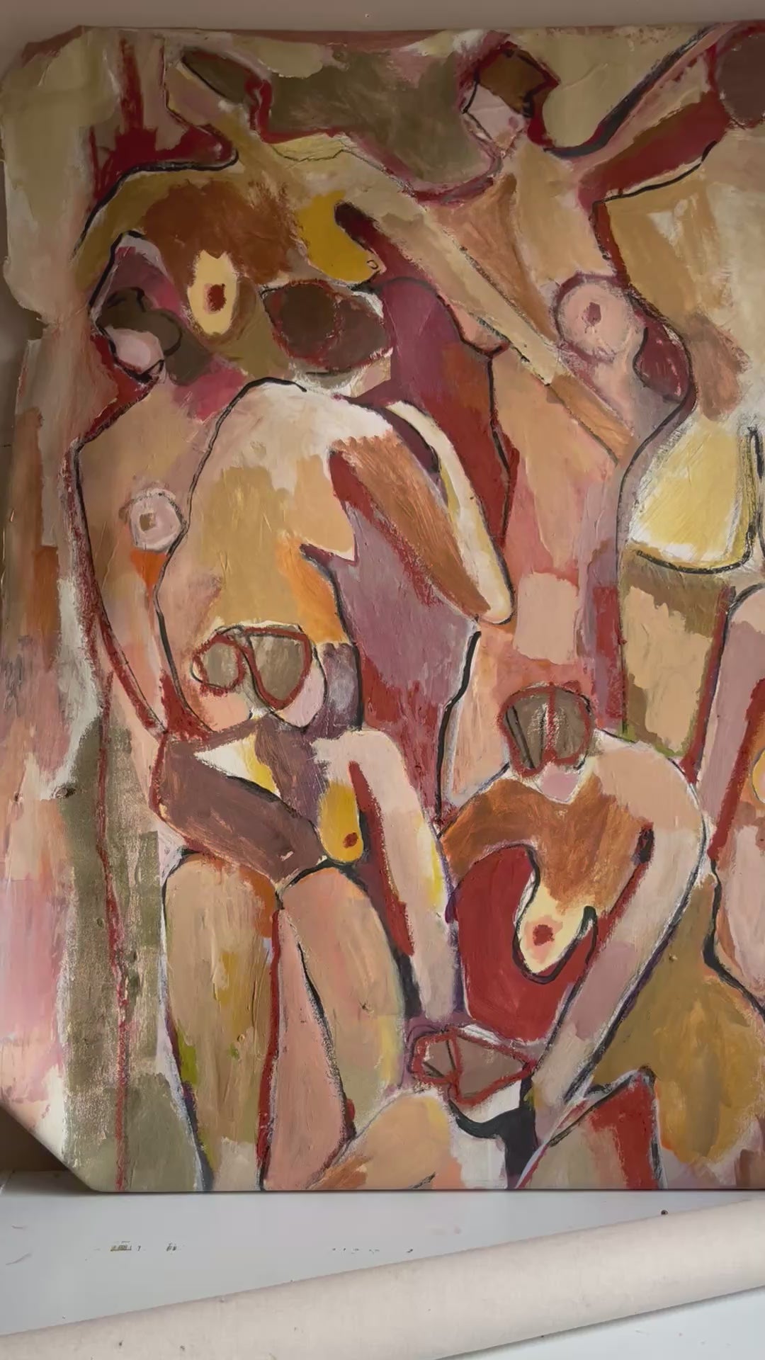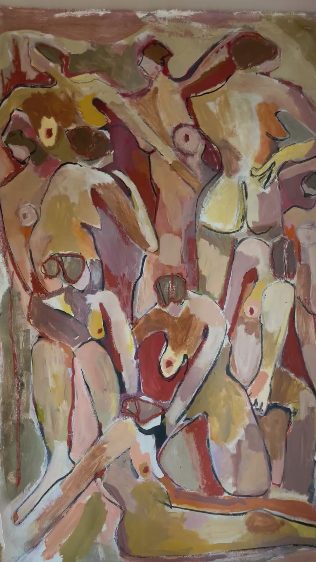This expressive original painting is full of movement showing women in shared, unspoken gestures. Layered strokes of ochre, rust, rose, and earthy browns —