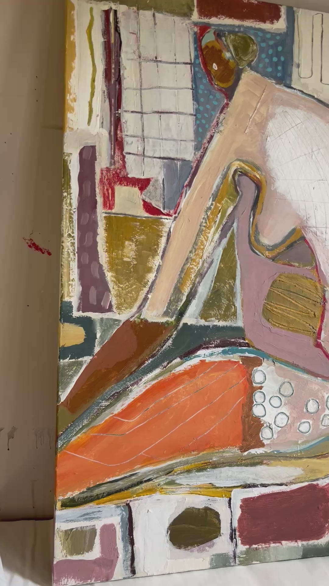 An intimate nude figure shaped by raw, textured strokes and subdued earth tones. Multiple layers of acrylic, plaster, and oil pastel build a rich, tactile surface that draws you in, where harsh lines gradually transform into gentle curves. The piece is finished with a triple matte varnish that safeguards the textured layers while maintaining a non-glossy appearance. Created on stretched canvas and signed on the back, this artwork continues a 'keep busy'- color filled series I am working on through the end of Fall.